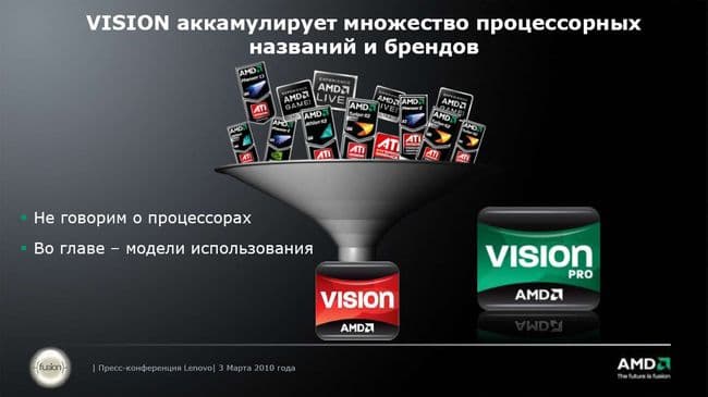Идея с платформами хорошая для лидера рынка или монополиста: на рынке есть платформа, мы подобрали ее для вас, пользуйтесь. Выбор? Какой вам выбор, мы лучше знаем, что вам нужно! Покупатель должен, увидев надпись AMD Vision, уже забиться в экстазе и немедленно купить продукт, даже не разбираясь, что у него внутри. Однако AMD не лидер рынка. Это относительно небольшая компания, долгое время существовавшая за счет любителей альтернативных решений и компьютерных энтузиастов. Которые как раз разбираются в начинке и привыкли сами выбирать, что им интересно. Пользователи, выбирающие «наклейки», до сих пор ищут заветное «Pentium»…