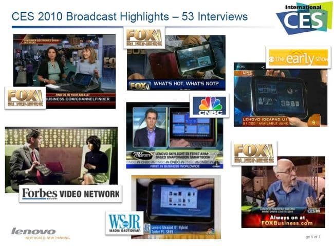 В своем выступлении Артур Вей сосредоточился на том, чтобы описать положение компании и ее успехи на рынке за последний год. В первой части он подробно рассказал о медиаповодах. Lenovo сделала много анонсов на CES, привлекла очень много внимания прессы (подробно отписавшейся о новинках), проведено 53 видеоинтервью, получены различные награды от изданий по итогам CES.