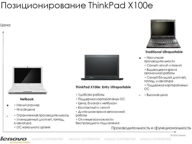 В секторе сверхпортативных решений у Lenovo есть нетбук S10 (и его модификация S9). Его достоинства: малые размеры и вес (экран 10 дюймов), длительное время работы от батарей. Недостатки: слишком маленькая ужатая клавиатура, с которой неудобно работать (хотя среди одноклассников она одна из самых удобных), очень низкий уровень производительности. Есть и корпоративная модель ThinkPad серии Х с 12-дюймовым экраном. Этот ноутбук функционален, производителен, очень удобен в работе. Но он значительно больше и тяжелее, а главное стоит очень дорого. В результате между этими двумя моделями образуется серьезный разрыв по размерам, функциональности и, что самое главное, цене. X100e призван закрыть этот разрыв.