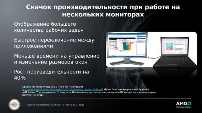 Ну и последнее работа на нескольких мониторах. В принципе, действительно важное достоинство, в некоторых случаях и для некоторых применений мультимониторная конфигурация незаменима. Правда, выразимся официально, указанная функциональность не является эксклюзивно доступной на системах AMD и может быть реализована на любых существующих платформах.