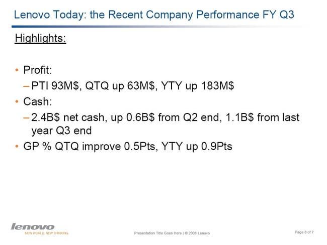 На следующем слайде данные о положении компании на рынке. Самый левый график показывает изменения рыночной доли Lenovo, средний рост на развивающихся рынках, наконец, последний слайд показывает рост компании в потребительском секторе. Стоит отметить, что первый слайд показывает долю Lenovo в продажах компьютеров вообще (т.е. не только ноутбуков) и учитывает весь мир. То есть, если я правильно понял, сюда включается Китай, где у компании сильнейшие (чуть ли не монопольные) позиции..
