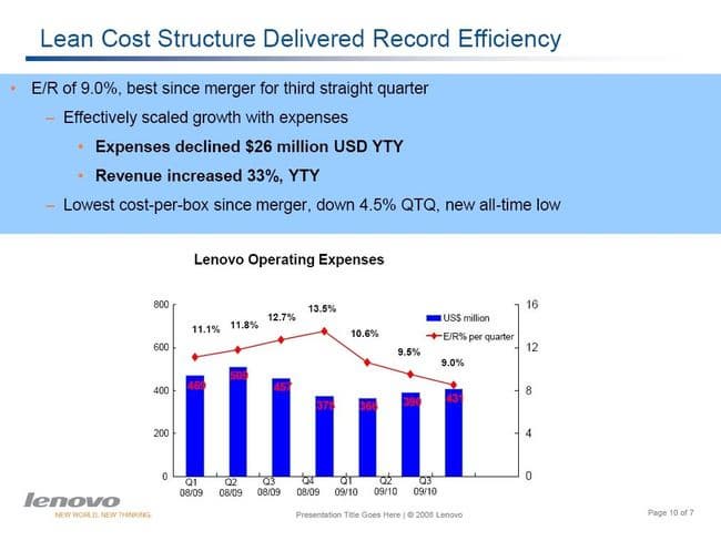 Как и многие другие компании, Lenovo крайне озабочена эффективностью, поэтому здесь показано, что компания не только наращивает выручку и прибыль, но и сокращает расходы благодаря чему достигает высокой эффективности.