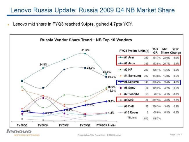 Наконец, последний слайд иллюстрирует динамику российского рынка. Правда, делать выводы по одному третьему кварталу сложно (особенно в том, что касается уменьшения долей Acer и ASUS), однако доля Lenovo растет и достаточно устойчиво. Но начиная снизу, легко показывать устойчивый рост.