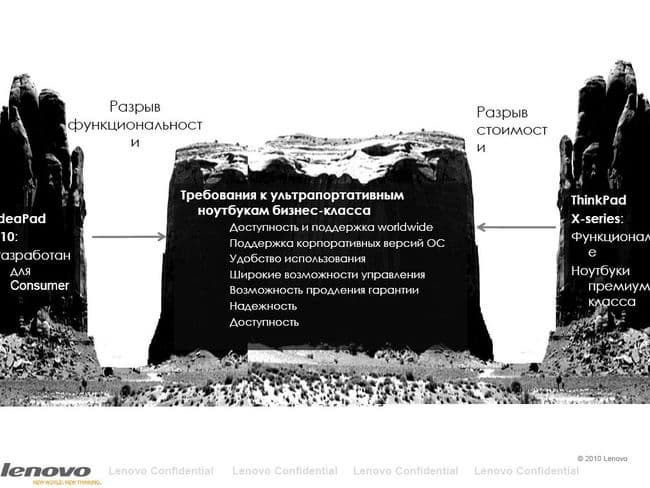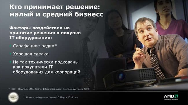 Кстати, на слайде не указано важнейшее различие в требованиях между корпоративным рынком и малым бизнесом, на которое я указал выше: цена. Малый бизнес не может позволить себе покупать технику по тем же ценам, что и корпоративные пользователи. Ценовой коридор, в котором готовы работать эти покупатели (согласно данным Lenovo), 400-1100 долларов. Соответственно, разрабатываемые продукты должны укладываться в эти ценовые рамки.