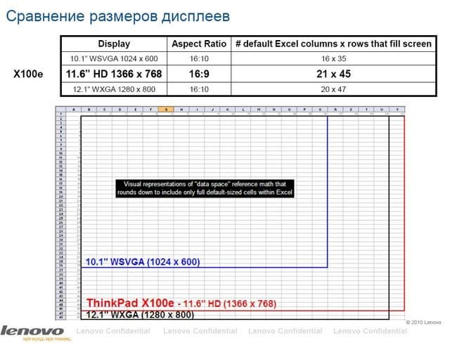 На следующем слайде анализируется удобство работы с экраном Х100е (разрешение экрана 1366х768 точек). Показано, сколько умещается ячеек электронной таблицы при той или иной диагонали экрана. Экран Х100е тут практически не отстает от 12-дюймового экрана. Должен отметить, что в тексте картина не будет столь радужная, т.к. текст выстраивается по вертикали, для такой работы удобнее всего вообще экран 4:3).