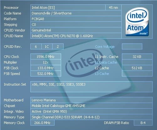 Зто стандартная платформа Intel Atom с процессором N270, с максимальной частотой работы 1,6 ГГц. В покое процессор снижает частоту до 800 МГц.