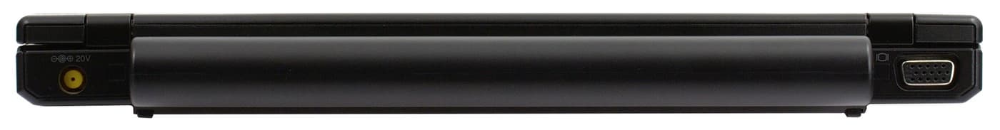 Сзади по центру — батарейка, с одной стороны от нее — выход VGA, с другой — питания. Оба разъема можно легко подключить на ощупь, заведя руку за ноутбук. Это начинаешь сильно ценить, полазив за матрицу в других ноутбуках (или закрывая ее каждый раз, когда вставляешь штекер питания). Шестиэлементная батарея, как уже отмечалось, выступает из корпуса, трехэлементная должна быть вровень с ним. Мне кажется, что вполне неплохим решением было бы вынести второй ряд не назад, а вниз, как сделано, например, у некоторых моделей HP. Тогда ноутбук приподнялся бы над столом: и клавиатура встала бы под удобным углом, и места для вентиляции под дном было бы больше.