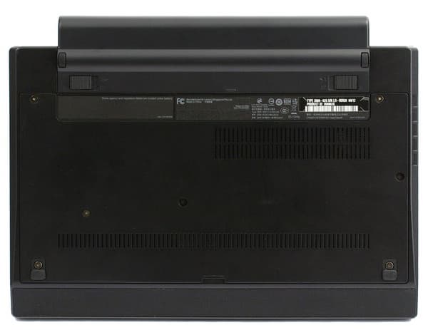 Батарея держится на двух защелках, и держится крепко: люфт отсутствует, и ноутубк вполне можно носить за нее. Задние ножки ноутбука расположены на батарее, без нее корпус плохо стоит на столе.