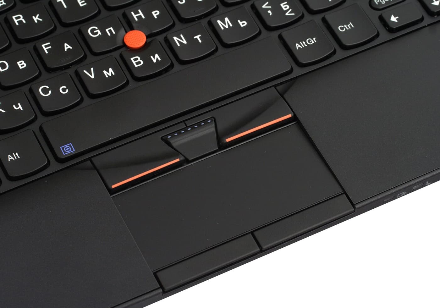 В этой модели два набора клавиш, все нажимаются очень мягко и с хорошо подобранным усилием. Кнопки трэкпоинта очень большие, даже слишком. Возможно, поэтому тачпад уехал вниз и получился таким узким, а его кнопки и вовсе оказались на передней грани. Кстати, из-за этого они постоянно нажимаются, если ноутбук куда-то уперт передней гранью.