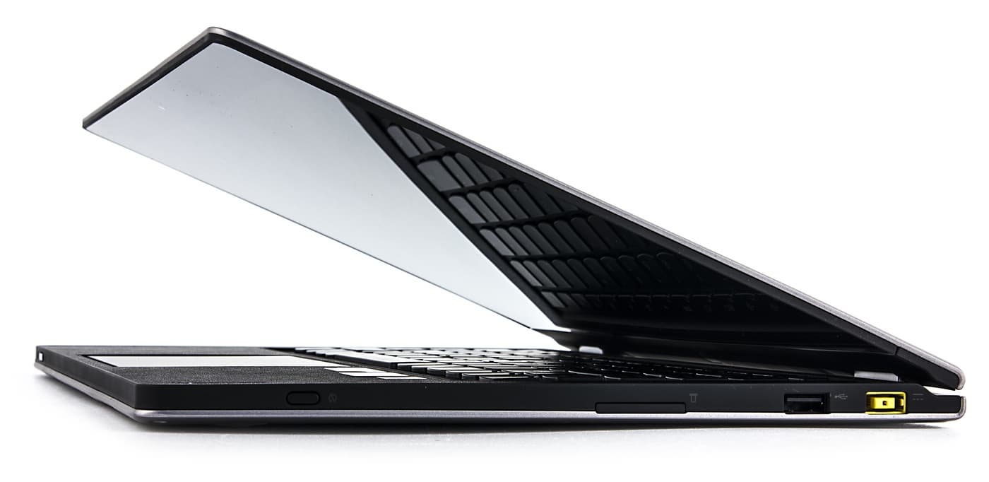 Боковые грани корпуса чуть вогнутые, так что верхняя и нижняя металлические крышки выступают вперед, защищая пластиковые элементы. За эту рамку вроде бы должно быть удобно цепляться, но в Yoga 13 все линии зализаны, поэтому уцепиться пальцем невозможно, рука соскальзывает, а ноутбук отодвигается на столе. Открывать его нужно двумя руками либо цепляться за угол. Усилие открытия крышки среднее. При закрытии в конце хода она захлопывается сама. О максимальном угле открытия крышки тут можно не говорить — он может быть любым, вплоть до 360 градусов.