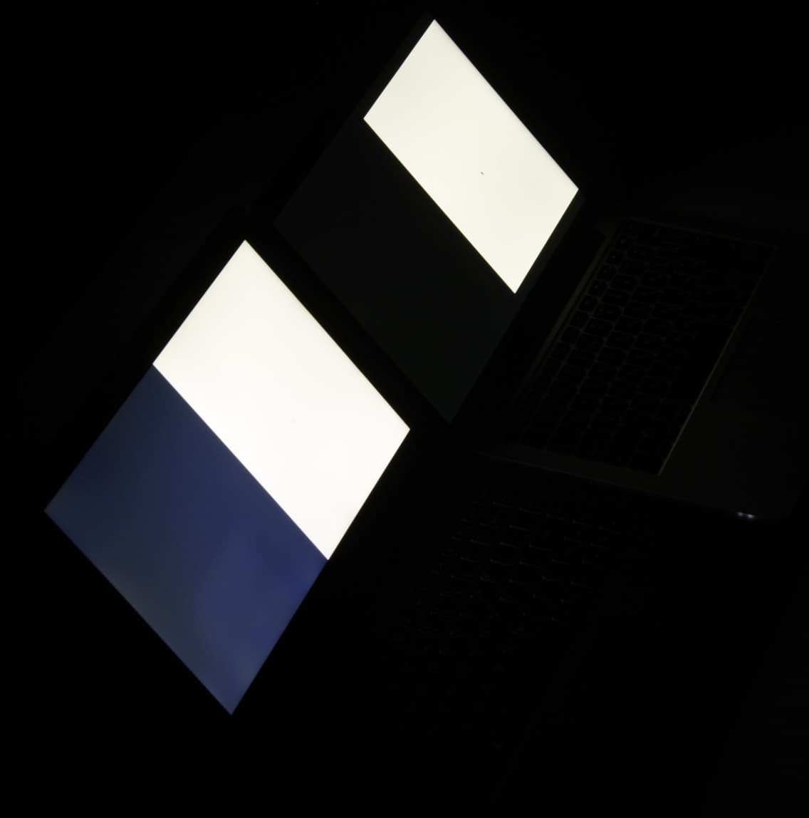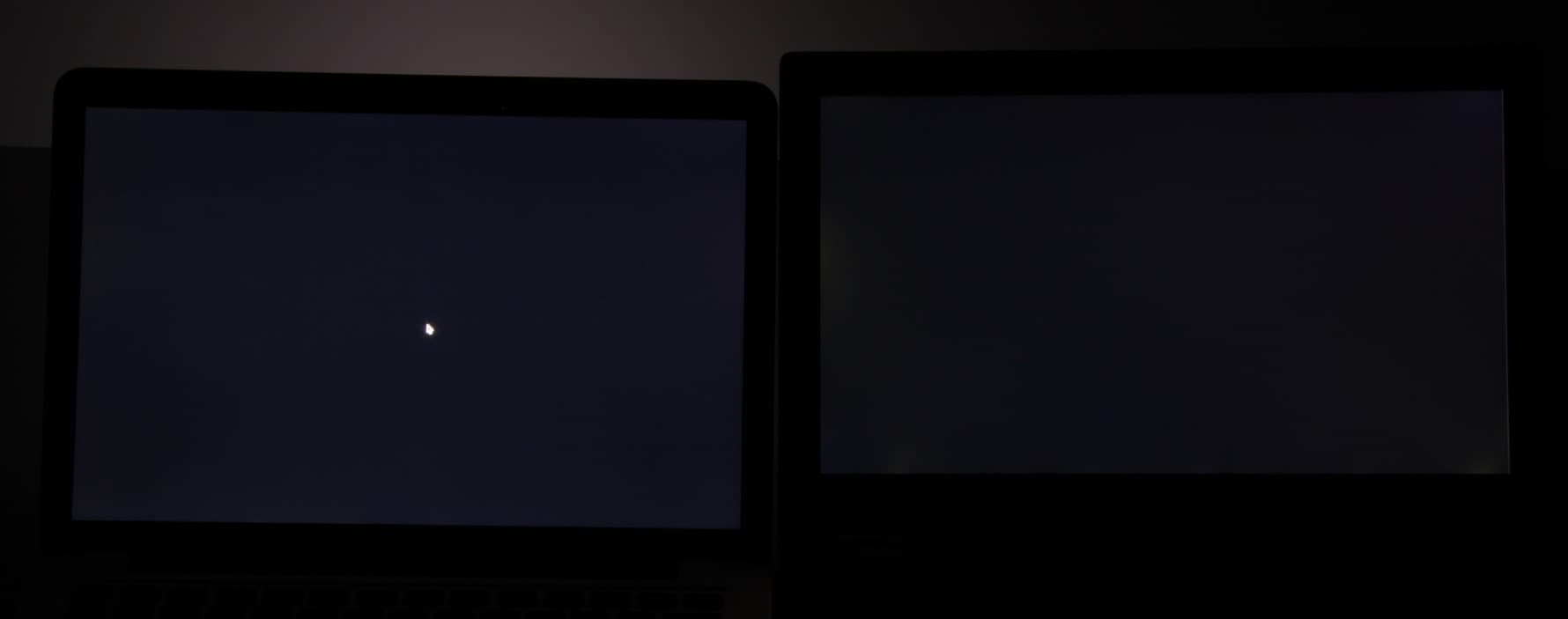 При перпендикулярном взгляде равномерность черного поля средняя, так как по границе экрана в нескольких местах есть засвеченные участки (слева для сравнения экран MacBook Pro):