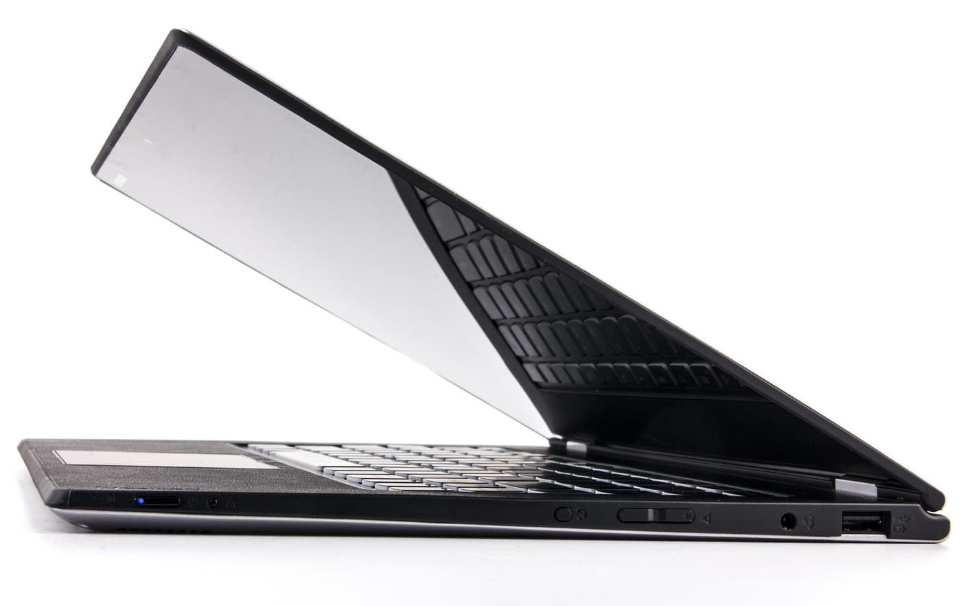 Так как передняя грань сделана с ребром жесткости, разместить на ней что-либо не представляется возможным. И это в принципе хорошо: у Yoga 13 там была кнопка питания, которая постоянно попадала под палец и случайно нажималась. В новой модели ее перенесли на бок. Это расположение кнопки питания мне понравилось: и случайно не нажмешь, и когда надо, нащупать относительно просто. Правда, чтобы проверить, в каком состоянии находится ноутбук, если экран выключен, вам придется отклоняться вправо и заглядывать на боковую грань.