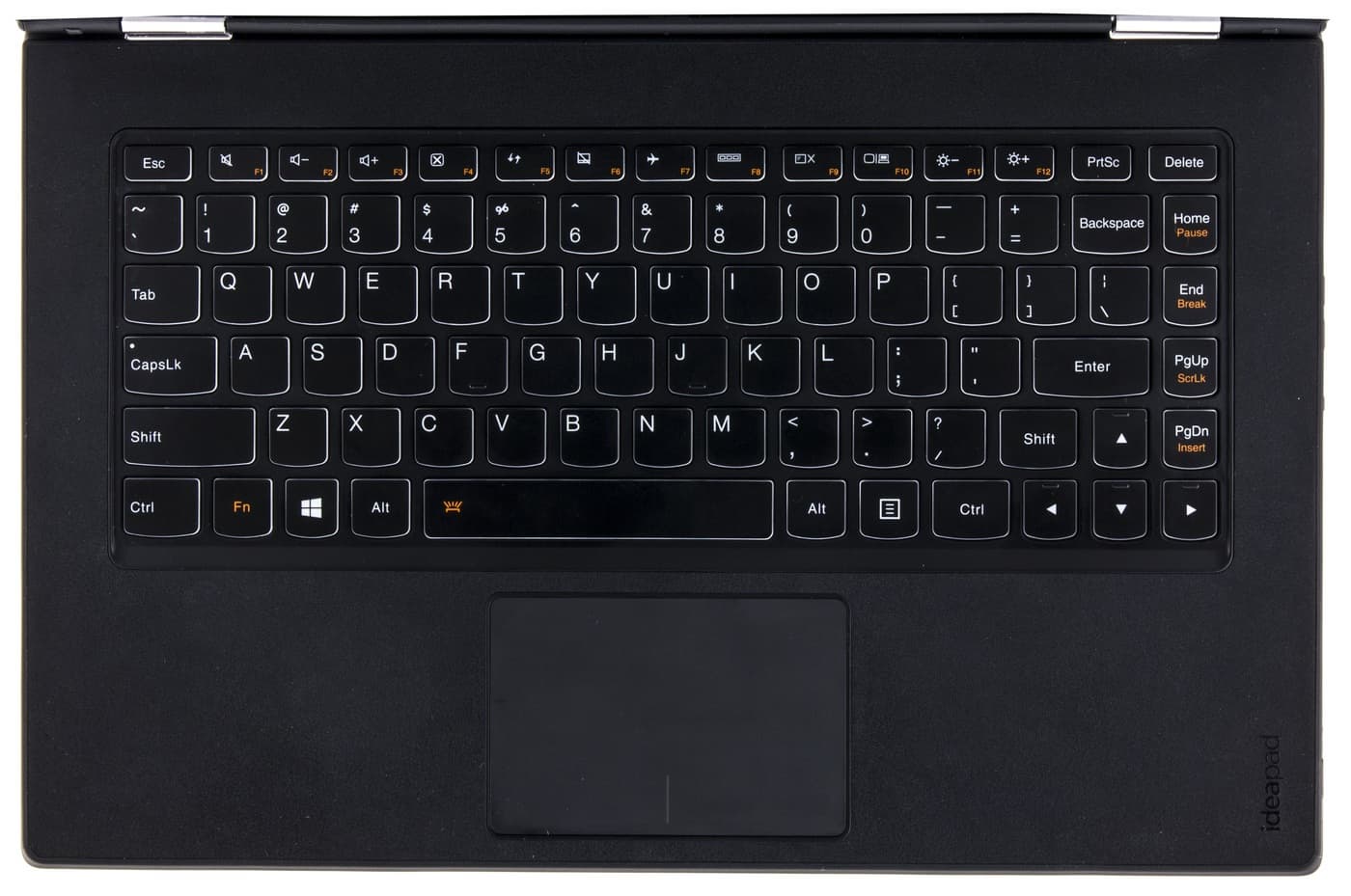 Явных минусов, мешающих в работе, у этой клавиатуры нет. Есть вещи, которые можно рассматривать, как особенности. Первая — курсор вдвинут в клавиатуру. У других ноутбуков это могло бы рассматриваться, как минус, т. к. при работе с курсором иногда можно задевать за соседние клавиши. Но в Yoga 13, благодаря особой форме клавиш, ложных нажатий не происходит никогда. Вторая особенность — расположение клавиш надкурсорного блока. Когда они выстроены в вертикальную линию справа, работать с ними удобно. Но у большинства ноутбуков они расположены так (сверху вниз): Home, PgUp, PgDn, End. Здесь же, как видите, расположение другое, поэтому при переходе с других ноутбуков придется переучиваться. Но расположение клавиш у Lenovo Yoga 13 в целом удобнее.