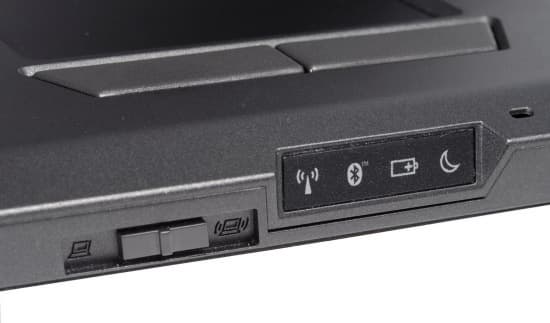 Индикаторы на корпусе разделены на две функциональные группы. Одна из них находится над клавиатурой, другая — на передней панели и смотрит вперед. Индикаторы, расположенные над клавиатурой (работы ноутбука, активности жесткого диска, включения клавиш numlock и capslock), расположены в удобном месте, проблем с читаемостью нет. А вынесенные на переднюю панель индикаторы читаются не очень уверенно, если вы сидите близко от ноутбука (и смотрите на него сверху) и их плохо видно при закрытой крышке, когда ноутбук стоит на столе (если смотреть сверху). А в эту группу вынесены индикаторы работы беспроводных сетей, и если их забыть во включенном состоянии, это может негативно сказаться на времени работы от батарей.