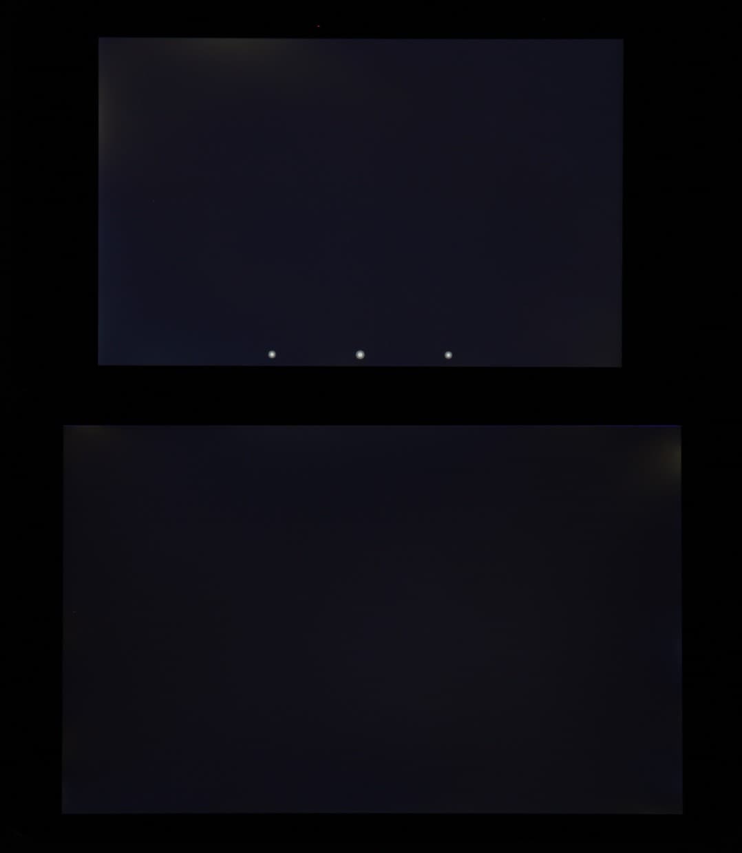 При перпендикулярном взгляде равномерность черного поля средняя, так как по границе экрана есть локальные участки с повышенной яркостью черного поля (яркие точки — это битые пиксели на матрице фотоаппарата, сравнение опять с Nexus 7):
