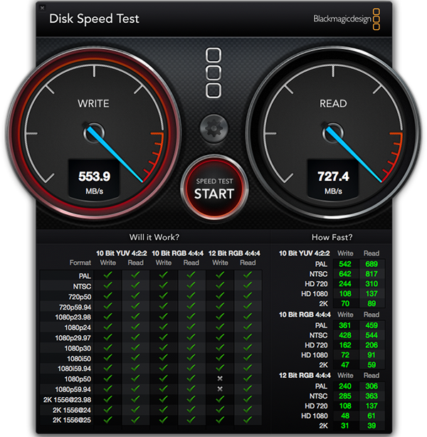 Последний тест — Blackmagic Disk Speed Test, измеряющий производительность накопителя. Результаты этого теста впечатляют: у 13-дюймового ноутбука MacBook Air (Early 2014) c SSD-накопителем Apple SSD SD0256F (256 ГБ) скорость чтения составляет 727,4 МБ/с, а скорость записи — 554 МБ/с.