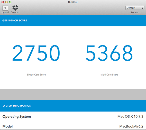 Дабы иметь возможность сравнить результаты тестирования 13-дюймового ноутбука MacBook Air прошлого года (Mid 2013) на процессоре Intel Core i5-4250U c результатами тестирования нашего ноутбука MacBook Air (Early 2014), мы также воспользовались предыдущей версией бенчмарка Geekbench (версией 2.3.4), для которой у нас были результаты тестирования ноутбука MacBook Air (Mid 2013).