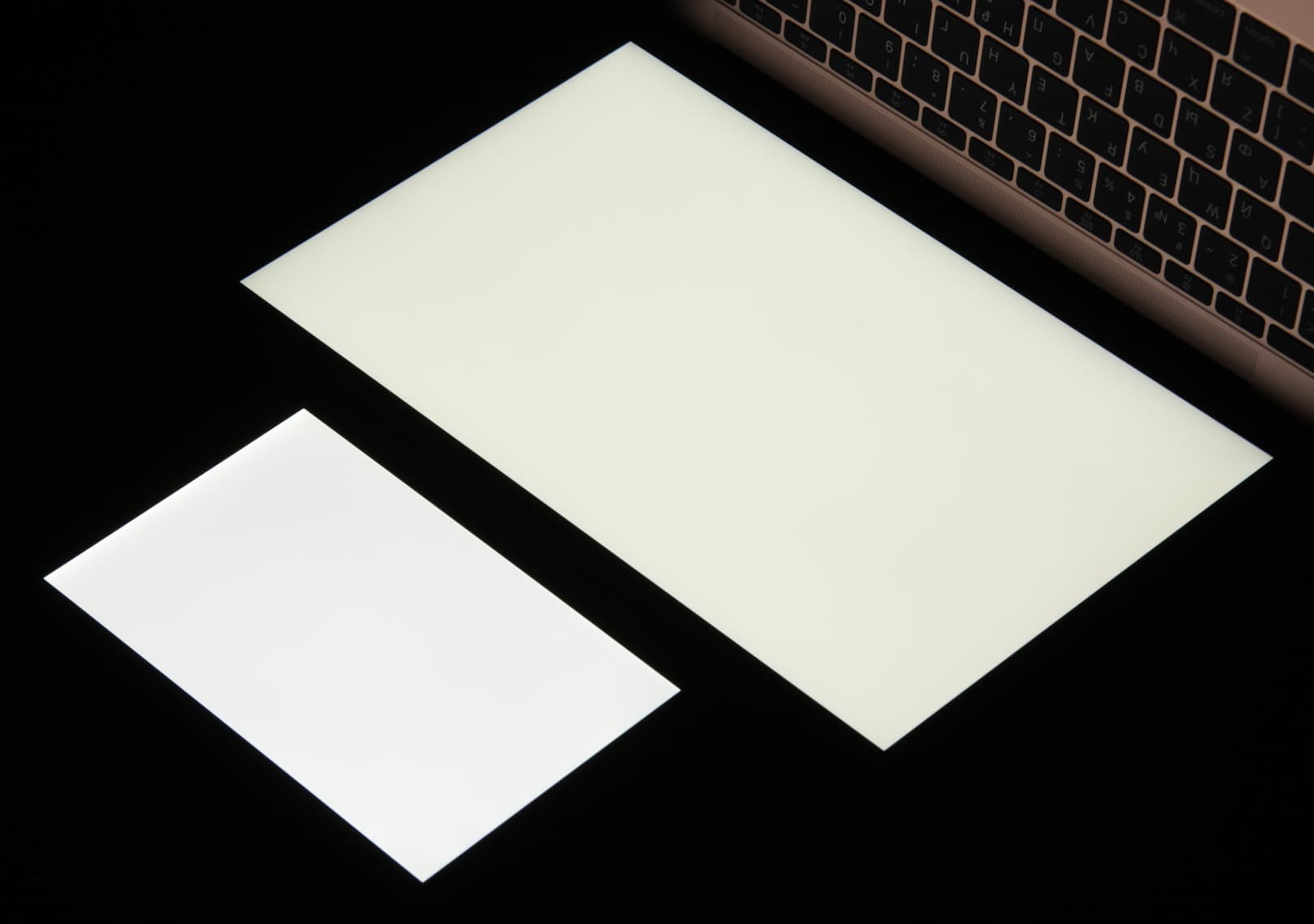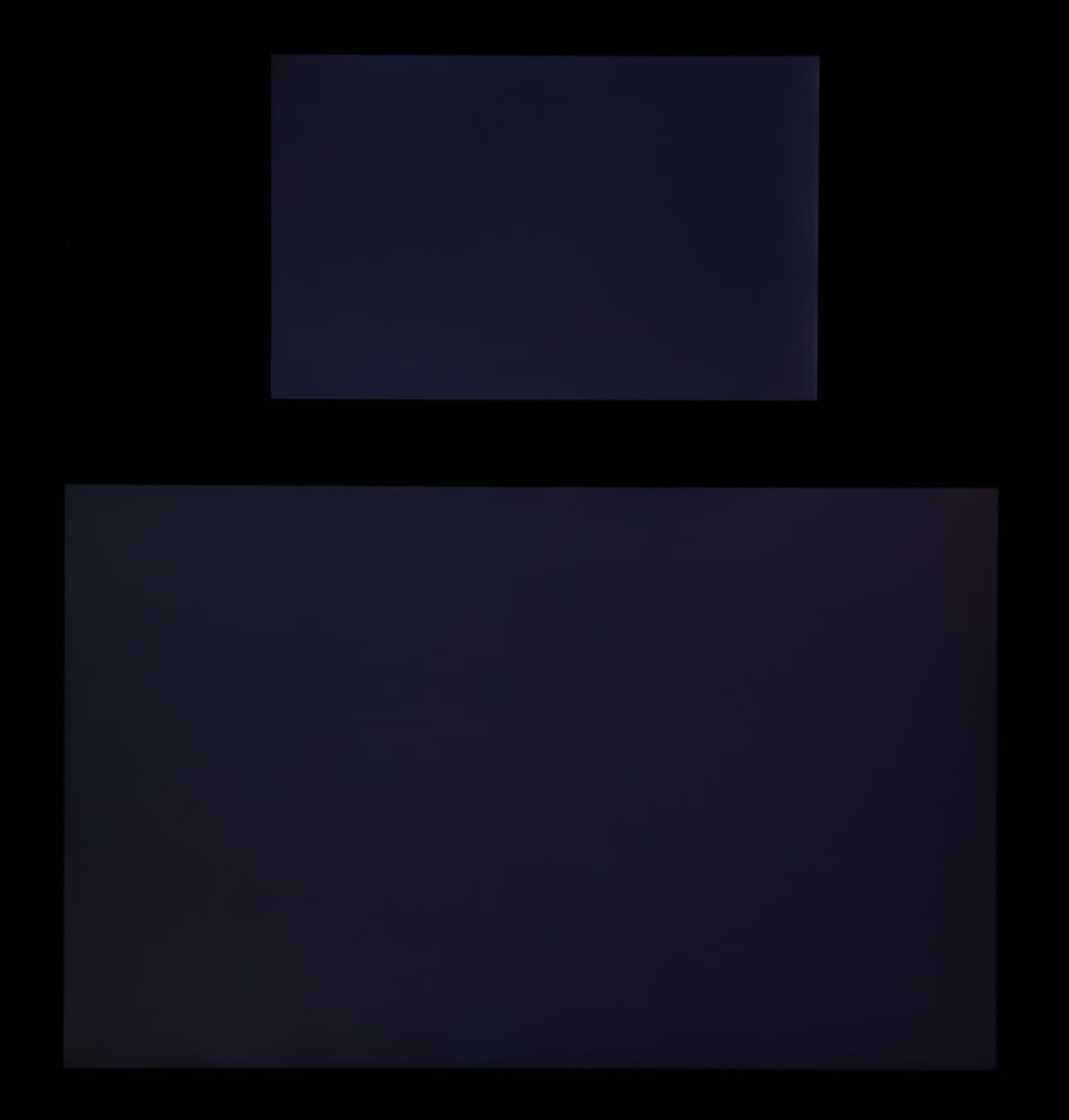 Яркость под этим углом у обоих экранов заметно уменьшилась (выдержка увеличена в 5 раз), и в случае MacBook Air падение яркости примерно такое же. Черное поле при отклонении по диагонали высветляется слабо и остается почти нейтрально-серым. Фотографии ниже это демонстрируют (яркость белых участков в перпендикулярном плоскости экранов направлении примерно одинаковая!):