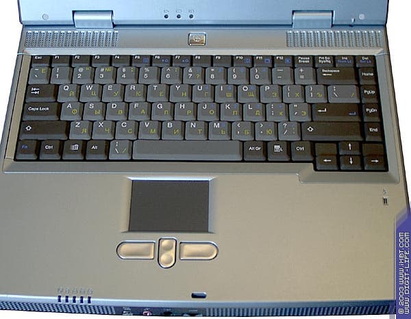Открываем крышку. Здесь тоже все по минимуму. Никаких кнопок быстрого вызова приложений только включение питания. Индикаторы состояния (слева направо работа от сети, работа от батареи, уровень заряда/зарядка батареи) расположены на крышке и видны с обоих ее сторон. Такое расположение, на мой взгляд, является оптимальным. При критическом уровне заряда индикатор (крайний справа) начинает мигать красным, при этом ноутбук достаточно противно пищит. И не захочешь заметишь. Индикаторы активности жесткого диска, оптического привода и состояния lock-ов расположены в нижней части и заходят на передний торец, так что их можно видеть и при закрытой крышке. Клавиатура удобная, благо размеры позволяют.