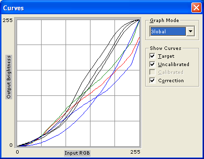 Приведены также графики гамма-кривых, где можно увидеть, насколько гамма-кривые индивидуальных цветов (черные линии) отклоняются от целевой гамма-кривой (синяя линия) и какая требуется коррекция для каждого цвета (соответственно красная, синяя и зеленая линии).