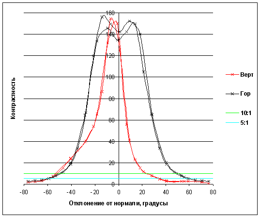 Зависимость контрастности (отношения яркости белого поля к яркости черного) в центре экрана от отклонения оси датчика (отрицательные значения — влево или вниз, положительные значения — вправо или вверх) от нормали к экрану в вертикальной и горизонтальной плоскостях. Зеленая линия — отношение 10:1, голубая — 5:1