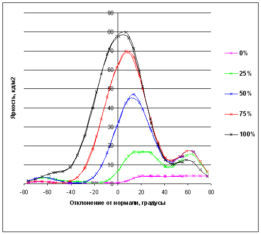 Похоже, что начинает вырисовываться общая картина для ноутбучных матриц (по крайней мере, бюджетных). Правда, у исследуемой матрицы несколько лучше ситуация с углами «вниз» полутона инвертируются (пересекаются 0, 25 и 50%) «только» при отклонении на 30°. При отклонении вверх слияние графиков 100% и 75% происходит при 20°, 100, 75 и 50% при 40 градусах.