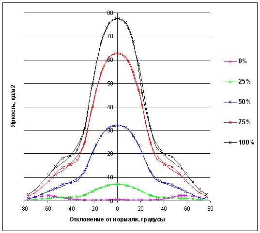 Зависимость яркости полутонов (0% — черный, 100% — белый) в центре экрана от отклонения оси датчика (отрицательные значения — влево, положительные значения — вправо) от нормали к экрану в горизонтальной плоскости