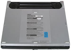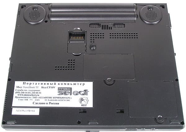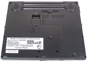 Решение, в общем-то, достаточно спорное — в случае, если ноутбук стоит на мягкой поверхности, звук глушится основательно. Впрочем, на роль музыкального центра этот ноутбук и не предназначается. Нижняя поверхность ноутбука служит и для крепления дополнительного аккумулятора — для этой цели служат прорези в передней части ближе к центру и сзади по бокам. Разъем может закрываться откидной крышкой.