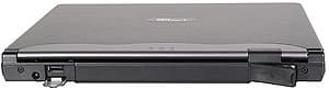 Большую часть заднего торца занимает аккумулятор. Слева от него — разъем для подключения источника питания и порт USB под крышкой. Справа, также под крышкой, выход на внешний монитор. На фотографии видно, что крышки разные. У порта USB она пластмассовая откидывающаяся, у VGA-выхода — резиновая, не фиксирующаяся. Смысл такого разделения мне не очень понятен. Возможно, разработчики не без оснований посчитали, что выход на внешний монитор будет использоваться гораздо реже.