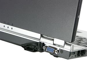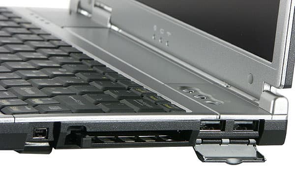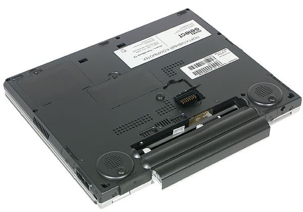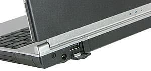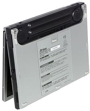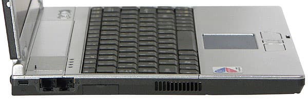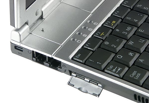 Большую часть заднего торца занимает аккумулятор. Слева от него — разъем для подключения источника питания и порт USB под крышкой. Справа, также под крышкой, выход на внешний монитор. Как и у модели TT, вызывает некоторое недоумение тот факт, что крышки разъемов разные. У порта USB она пластмассовая откидывающаяся, у VGA выхода — резиновая не фиксирующаяся. Естественно, пользоваться первой гораздо удобнее. По-видимому, причина — опять-таки, стремление удешевить ноутбук — разработчики не без оснований посчитали, что выход на внешний монитор будет использоваться гораздо реже. На крышке хорошо заметен индикатор активности устройства беспроводной связи. У TT на этом месте был индикатор наличия непрочитанной почты.