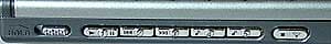 Спереди расположен блок кнопок управления проигрыванием компакт-дисков, они же кнопки быстрого вызова приложений, картовод и аудиоразъемы. Расположение кнопок быстрого вызова на переднем торце непривычно, хотя после привыкания пользоваться ими достаточно удобно. Картовод расположен удобно, а вот расположение аудиовыхода, на мой взгляд, не оптимально. Попробуйте подключить что-нибудь, кроме наушников — провод явно будет мешаться.