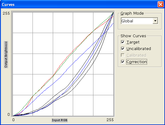 Приведены также графики гамма-кривых, где можно увидеть, насколько гамма-кривые индивидуальных цветов (черные линии) отклоняются от целевой гамма-кривой (синяя линия) и какая требуется коррекция для каждого цвета (соответственно красная, синяя и зеленая линии).