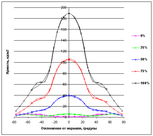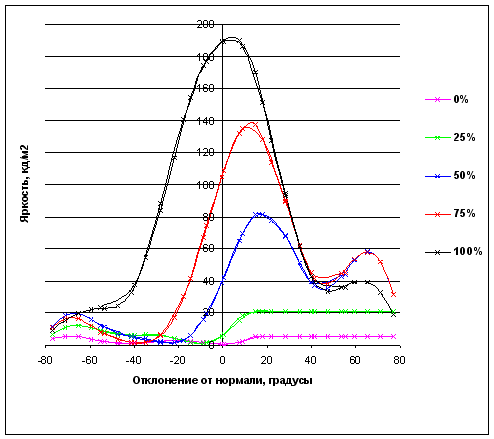 Зависимость яркости полутонов (0% – черный, 100% – белый) в центре экрана от отклонения оси датчика (отрицательные значения – влево, положительные значения – вправо) от нормали к экрану в горизонтальной плоскости