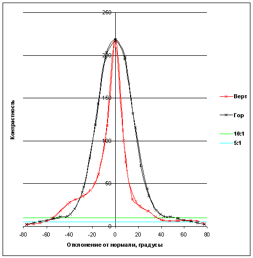 Зависимость контрастности (отношения яркости белого поля к яркости черного) в центре экрана от отклонения оси датчика (отрицательные значения — влево или вниз, положительные значения – вправо или вверх) от нормали к экрану в вертикальной и горизонтальной плоскостях. Зеленая линия — отношение 10:1, голубая — 5:1