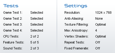Основной тест — FutureMark 3DMark03. Для обеспечения результатов используется Patch 3.30. Установки теста — по умолчанию.