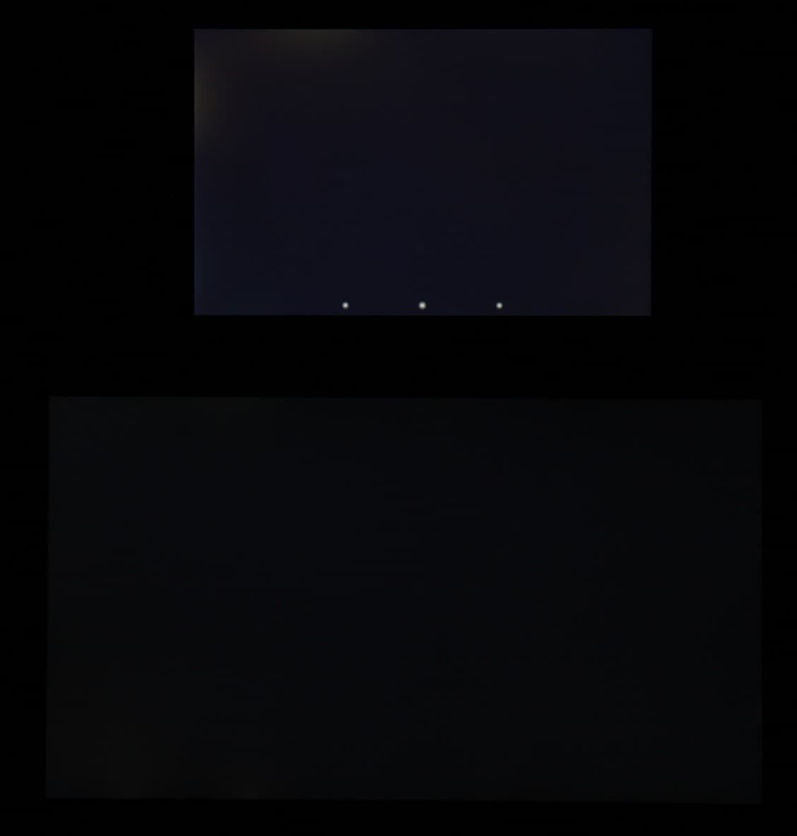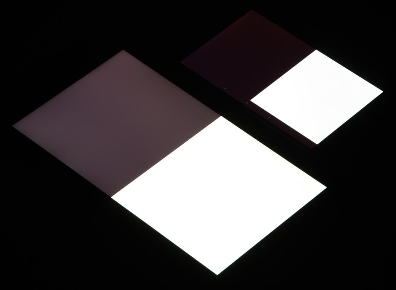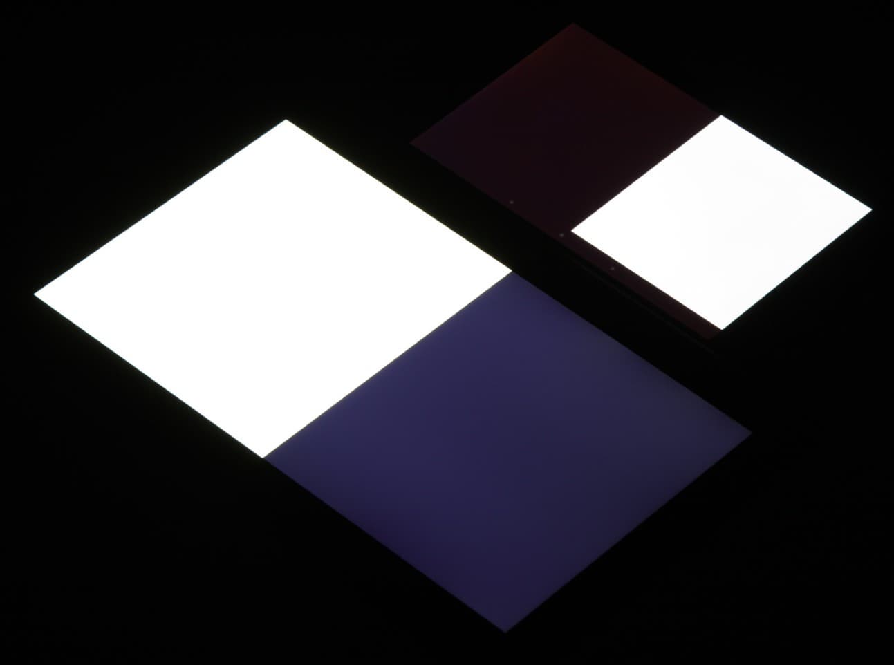 Яркость под углом у обоих планшетов заметно уменьшилась (как минимум в 4 раза, исходя из разницы в выдержке), но в случае Surface Pro 2 падение яркости меньше (яркость по фотографиям 241 против 225 у Nexus 7). При этом цветовой тон изменился несильно. Черное поле при отклонении по диагонали высветляется сильно и приобретает фиолетовый или красно-фиолетовый оттенок. Фотографии ниже это демонстрируют (яркость белых участков в перпендикулярной плоскости экранов направлении у экранов одинаковая!):