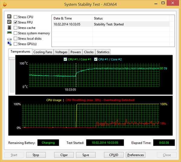 При загрузке процессора тестом Stress FPU, который использует вычисления c плавающей точкой и в большей степени нагревает процессор, установившаяся частота процессора колеблется от 1,8 до 2,2 ГГц. Температура ядер процессора в этом режиме достигает 80 °С и наблюдается троттлинг.