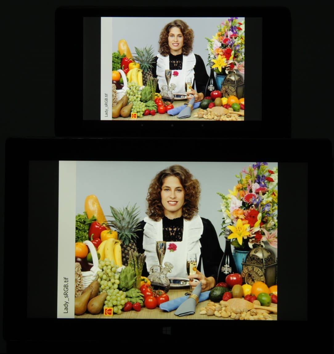 Видно, что различия в цветопередаче невелики, но изображение на Surface Pro 2 чуть менее насыщенное (обратите внимание, например, на фрукты), впрочем, это единственный обоснованный вывод, который можно сделать по фотографии. И белое поле: