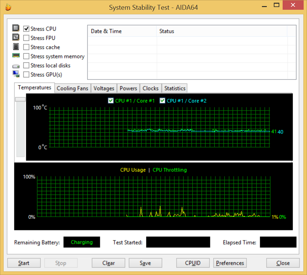 В режиме простоя, как и должно быть, частота процессора в ноутбуке составляет 800 МГц (естественно, речь идет о сбалансированной схеме энергопотребления), то есть к технологии Intel SpeedStep никаких нареканий нет. При этом температура процессора в режиме простоя не превышает 41 °С, что является отличным результатом.