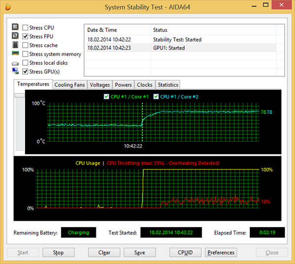 При одновременной загрузке графического ядра (Stress GPU) и ядер процессора (Stress FPU) частота ядер процессора колеблется от 1,5 до 2,0 ГГц, а температура составляет порядка 78 °С. И в этом режиме также наблюдается троттлинг.