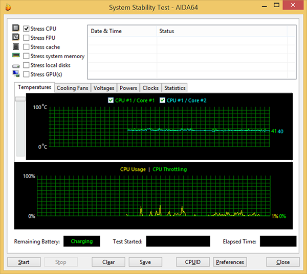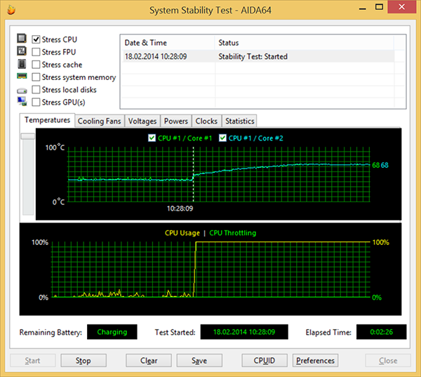 При загрузке процессора тестом Stress CPU (утилитой AIDA64 Extreme Edition — тест на стабильность системы), который использует целочисленные вычисления, частота процессора составляет 2,3 ГГц (напомним, что для процессора Intel Core i5-4200U максимальная частота в режиме Intel Turbo Boost составляет 2,6 ГГц). Температура процессора в этом режиме загрузки не превосходит 70 °С, что вполне допустимо.