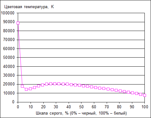 Цветовая температура ЖК-экрана ноутбука MSI GE70 2OD более-менее стабильна по всей шкале серого, хотя и немного завышена. Так, ее значение составляет примерно 10000 K в светлых тонах и возрастает до 20000 K в темных тонах (рост цветовой температуры в темных тонах по шкале серого (менее 10% белого) можно не учитывать, поскольку это связано с погрешностью измерения).