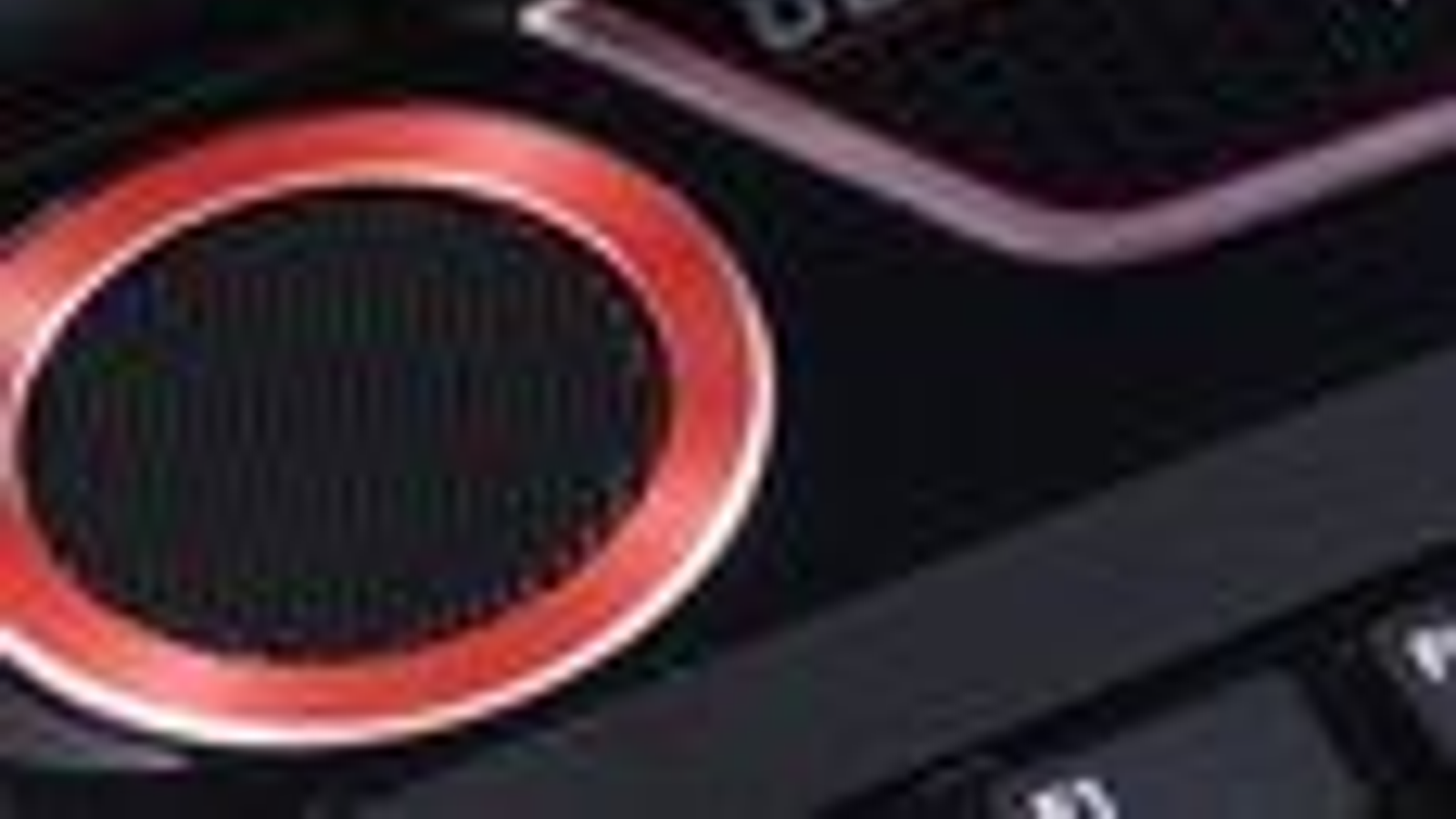 Но больше всего привлекает к себе внимание вставка над клавиатурой, где находятся дополнительные сенсорные клавиши и основные динамики аудиосистемы. Панель выделена красноватой окантовкой (но дизайнеры не стали делать ее ярко-красной), внутри находятся серые кнопки (при включении они загораются оранжевым) и огромный щит включения питания, который меня особенно впечатлил. К сожалению, панель с сенсорными кнопками сделана черной и глянцевой так что, даже несмотря на текстуру внутри, активно собирает отпечатки пальцев. А их там будет много, т. к. сенсорные кнопки приходится нажимать достаточно часто.