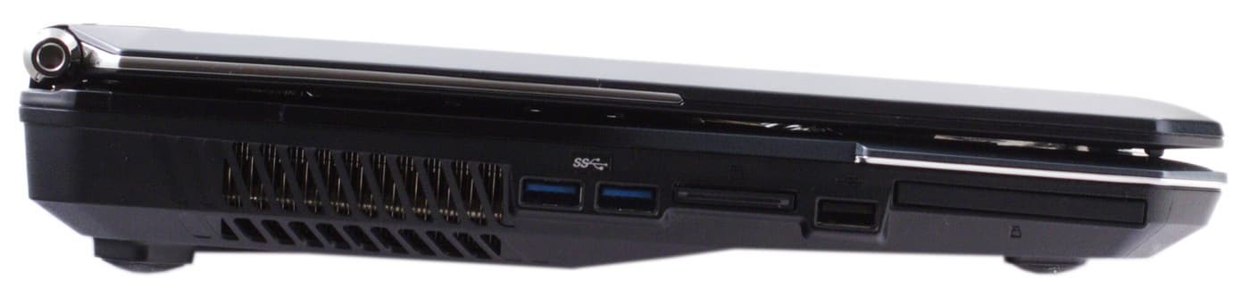 На левой панели расположена еще одна большая вентиляционная решетка (хорошее охлаждение — ключ к хорошей работе игрового ноутбука), рядом расположены два порта USB 3.0, картовод и порт USB 2.0. Совсем близко к передней панели расположен слот ExrpessСard.