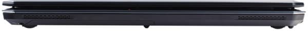 На задней панели находится выхлопная решетка вентиляции, с другой стороны — декоративный элемент под выхлоп второй системы охлаждения (собственно, это и напоминает игровой ноутбук ASUS). Посередине расположена площадка, на которой находится разъем питания, разъем проводной сети, порты eSATA (здесь он не скомбинирован с USB) и HDMI. В левом углу — порт для замка Кенсингтона.