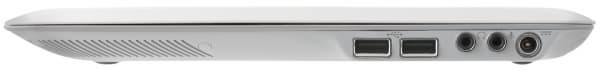 На правом борту расположены еще два порта USB, два аудиоразъема и разъем для штекера питания. Штекер питания длинный и достаточно далеко выступает из ноутбука.