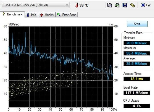 Диск относительно медленный при линейных операциях. Для этого ноутбука такой жесткий диск подойдет, но не стоит ожидать от него чудес производительности. Обратите внимание, что он слабо греется при тесте, температура осталась на уровне 33 градуса – это очень хороший показатель.