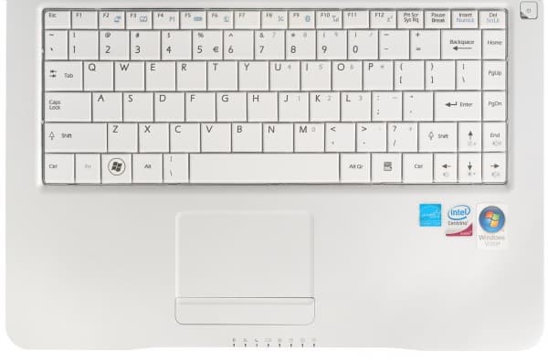 Откроем ноутбук. Клавиатурная панель того же бело-серого цвета, что и нижняя часть корпуса, она выглядит чистенько и аккуратно. Думаем, что грязь от рук на ней должна быть заметна, но клавиатуру легко чистить. Клавиатура чисто белого цвета, она значительно светлее, чем панели корпуса, и выглядит дешево. Подробнее мы поговорим о клавиатуре и тачпаде в соответствующем разделе.