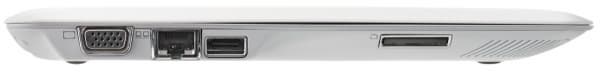 На левой грани расположены: VGA-выход на внешний монитор, разъем для проводной сети RJ-45 и один порт USB. Картовод расположен почти на нижней грани. Чтобы до него добраться, надо чуть ли не перевернуть ноутбук. В картоводе в обычном состоянии вставлена заглушка – чтобы вставить карточку, ее нужно вытащить. Несомненный плюс – карточка утапливается в картовод полностью, то есть можно носить с собой ноутбук с вставленной карточкой, и она не будет ни за что цепляться.