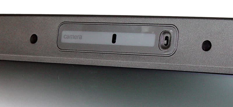 Сама камера выполнена оригинально. Размещение вроде бы стандартное — сверху на рамке экрана, но вот окошко объектива почему-то овальное, да и рычажок какой-то сбоку заметен. Дело в том, что в данной модели реализована возможность изменения зоны обзора объектива по вертикали. С помощью рычажка камера скользит вверх-вниз внутри крышки.